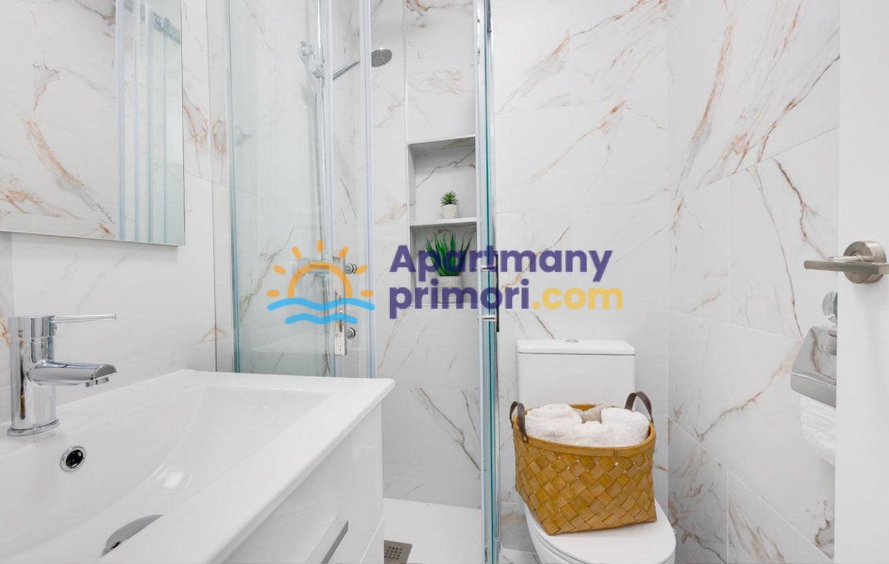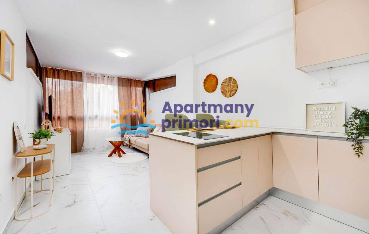 Apartmán sa nachádza priamo pri pláži a ponúka nádherný, ničím nerušený výhľad do záhrady a čiastočný výhľad na more. Jeho poloha je bezkonkurenčná – iba 50 metrov od mora, obklopený krásnymi plážami a zátokami, čo z tejto nehnuteľnosti robí ideálnu voľbu pre trvalé bývanie, druhý domov alebo investíciu. Apartmán sa nachádza na prízemí, avšak jeho vyvýšená poloha vytvára pocit prvého poschodia a poskytuje viac súkromia a prirodzeného svetla.