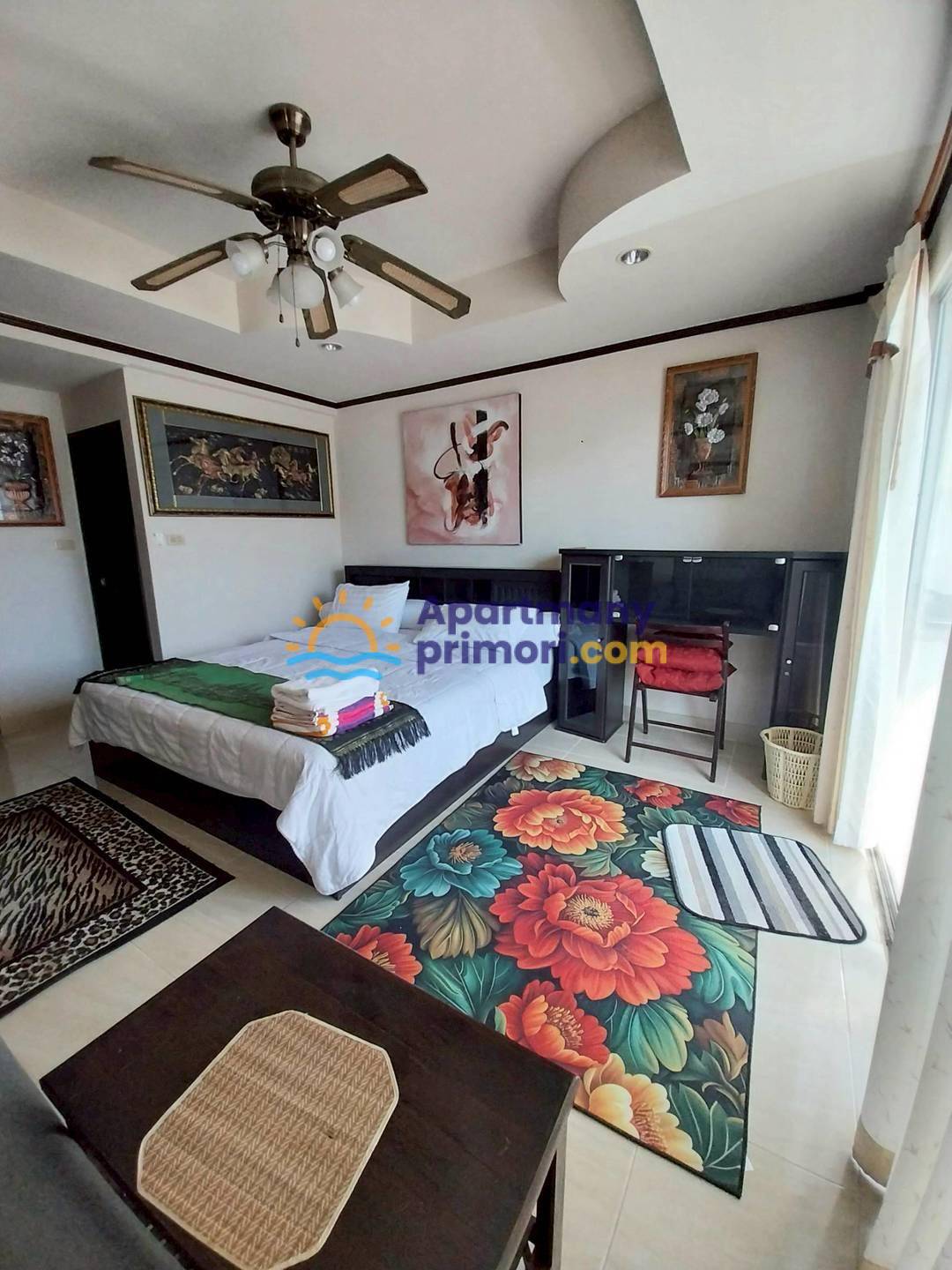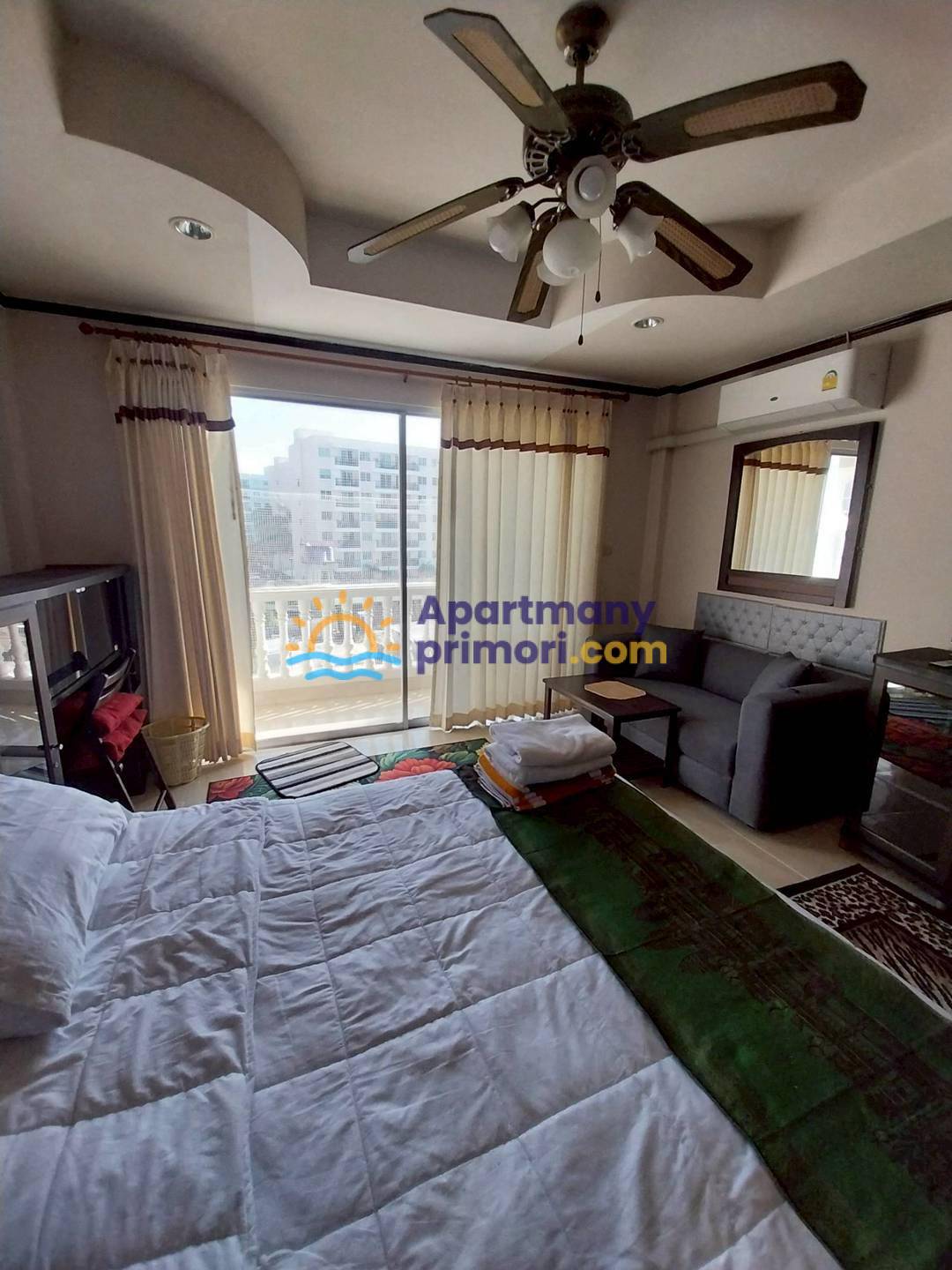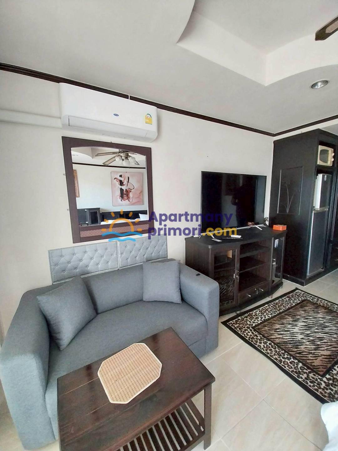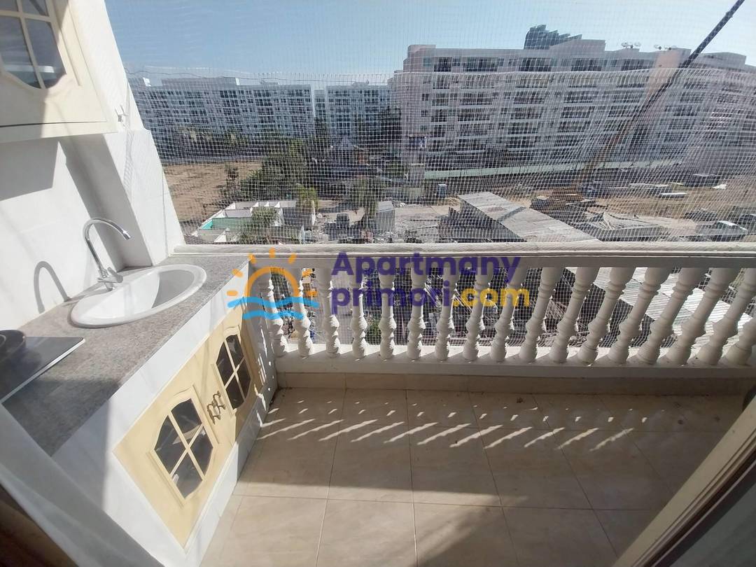 Apartmán sa skladá z jednej izby v ktorej sa nachádza manželská posteľ, gauč s TV, kúpeľňa so sprchovým kútom a WC. Apartmán má balkón. V byte je klimatizácia. Apartmán je zariadený – chladnička, práčka, jedálenský stôl, gauč, TV, manželská posteľ. K dispozícii je bazén, 24 h security s CCTV, parkovanie.